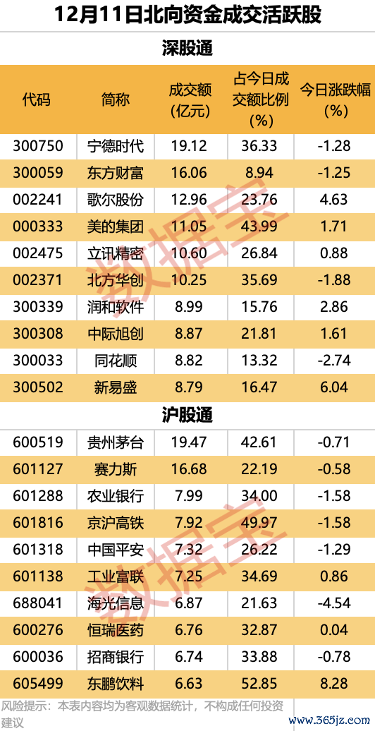 从成交额占比统计,东鹏饮料北向资金成交额占该股当天交易额的比例超50%,占比最高。