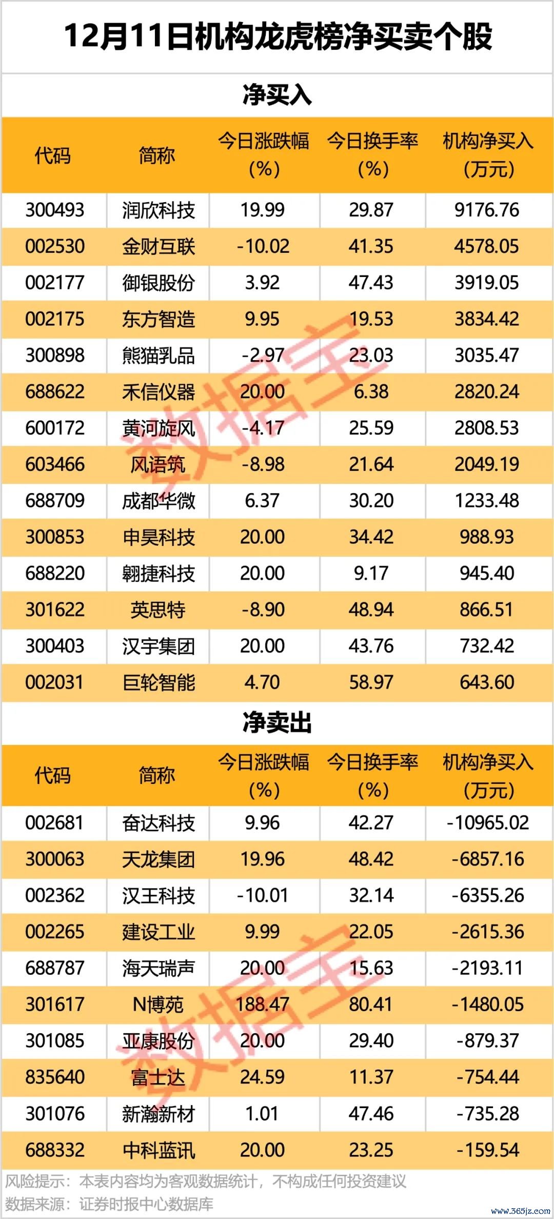 12月11日龙虎榜中,机构净买入的个股有14只,净买入金额居首的是润欣科技,机构净买入金额9176.76万元。