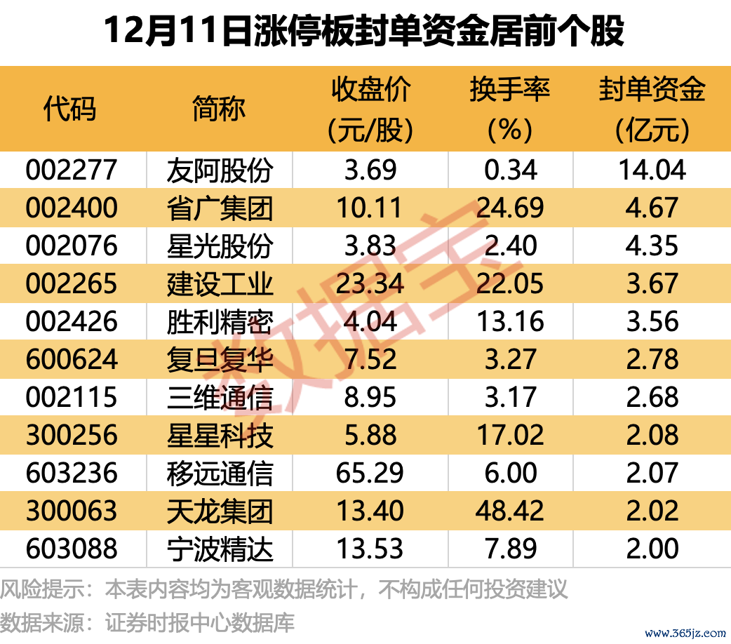 从连续涨停天数看,一鸣食品已连收12个涨停板,连续涨停板数量最多;日上集团11天10板,建设工业8天7板。