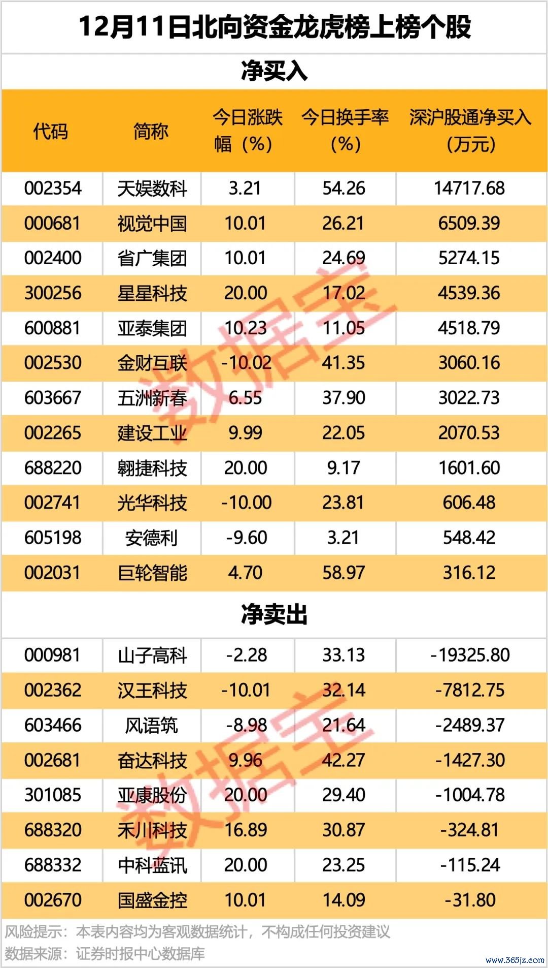 龙虎榜上,北向资金今日净买入12股,净买入金额最多的是天娱数科,北向资金净买入1.47亿元。