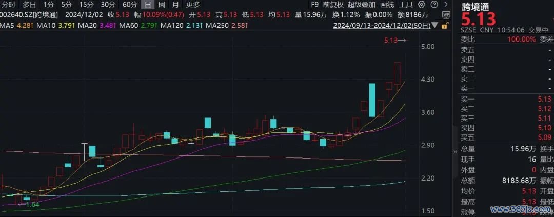 12月2日,跨境通(002640)开盘即封死涨停,报5.13元/股,总市值近80亿元。
